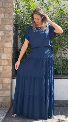 Saia longa em camada 3 Marias e blusa solta em gola canoa.